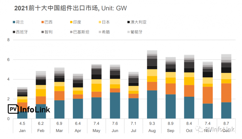 中國2021年出口了40.9GW的組件到歐洲市場,相較前一年的26.7GW同比成長了54%。受惠于能源轉型趨勢,歐洲持續(xù)維持最大的組件進口市場,全球占比46%。主要的國家包括了荷蘭、西班牙、希臘、葡萄牙、波蘭和德國,都達到了GW級以上的進口量,其中荷蘭為中國的第一大出口國,全年總量來到了23.8GW。但是在十一月時,受到了歐洲法院專利判決的影響,部分廠家無法銷售受影響產(chǎn)品,進口量快速下滑。