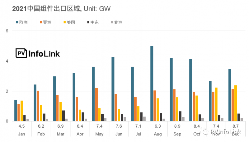 亞洲市場是從23.3GW微幅下降到22.4GW,2021全年占比下降為25%,但仍是中國組件出口的第二大市場,GW級進口國包括印度、日本、澳大利亞和泰國,韓國與馬來西亞也有接近1GW的進口量。2020年亞洲從中國進口最多組件的越南則是在補貼政策結束后進口量快速減少,從原本的最大進口國下降到僅有0.4GW的進口量。