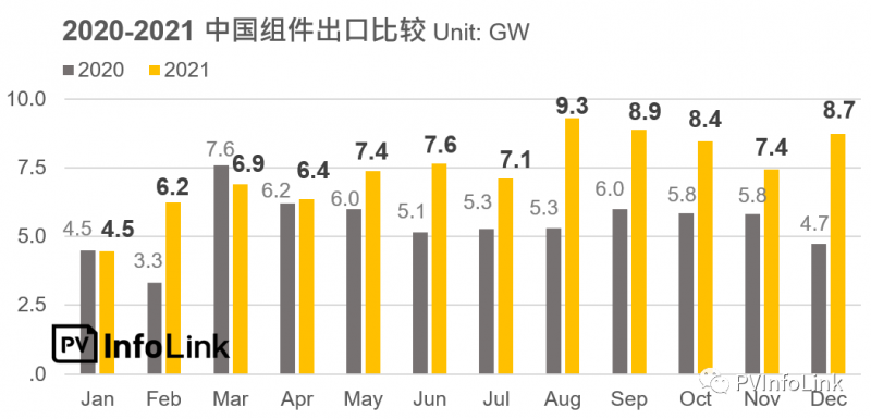 下半年進入了傳統(tǒng)的市場旺季,但是受到產(chǎn)業(yè)上游的瓶頸,造成整體供應鏈價格上升,以及中國的能耗政策影響,進一步推升了組件的價格,高昂的海運價格也增加了廠家的負擔,終端在獲利考慮下需求暫緩,采取了包括延后發(fā)貨與重新議價等措施,導致了傳統(tǒng)旺季的下半年,中國組件出口卻呈現(xiàn)了下降的趨勢。