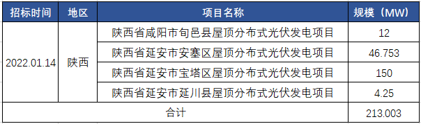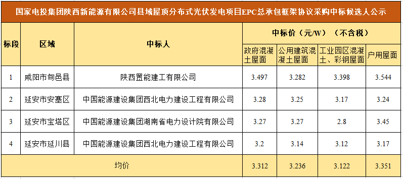 3月2日,國家電投集團(tuán)陜西新能源有限公司縣域屋頂分布式光伏發(fā)電項(xiàng)目EPC總承包框架協(xié)議采購中標(biāo)候選人公示。項(xiàng)目合計(jì)規(guī)模為213MW,陜西置能建工有限公司中標(biāo)咸陽市旬邑縣12MW屋頂分布式項(xiàng)目,中能建三個(gè)子公司中標(biāo)剩余201MW項(xiàng)目。所有項(xiàng)目均價(jià)為3.26元/W。
