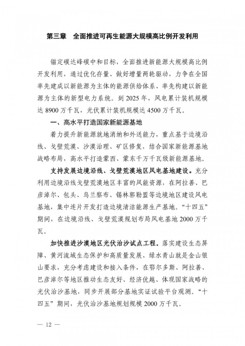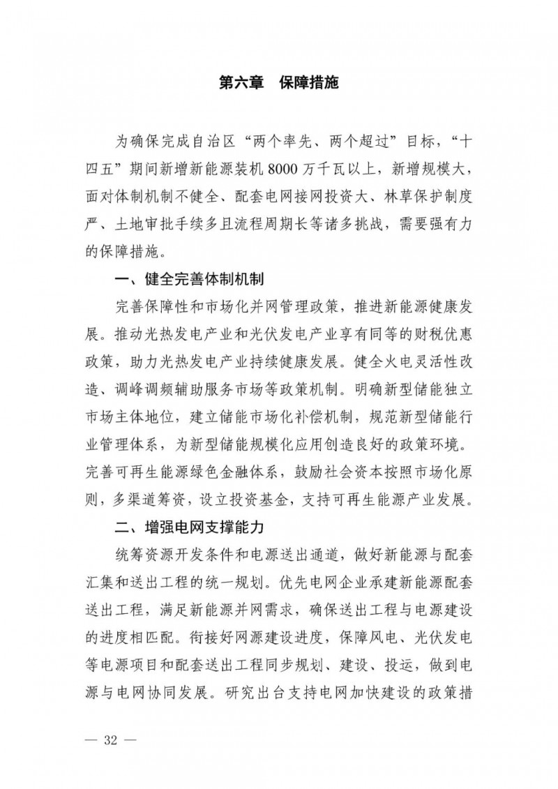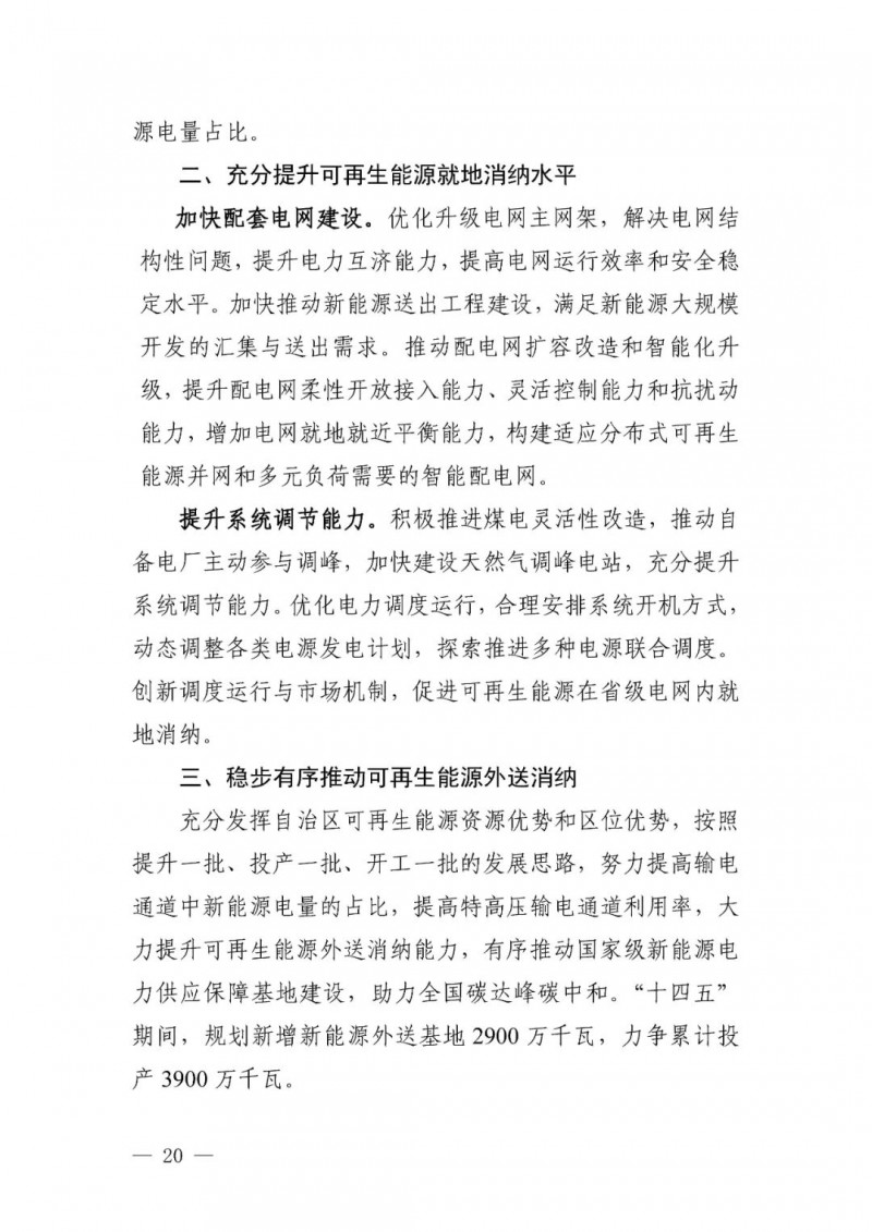 可再生能源發(fā)電目標。自治區(qū)可再生能源發(fā)電裝機達到 1.35 億千瓦以上,其中風電 8900 萬千瓦、光伏發(fā)電 4500 萬千瓦,新能源裝機規(guī)模超過燃煤火電裝機規(guī)模,新能源發(fā)電量占自治區(qū)總發(fā)電量比重超過35%。“十四五”期間可再生能源新增裝機 8000 萬千瓦以上,占全部新增裝機的比重超過 60%,成為新增裝機的主力。