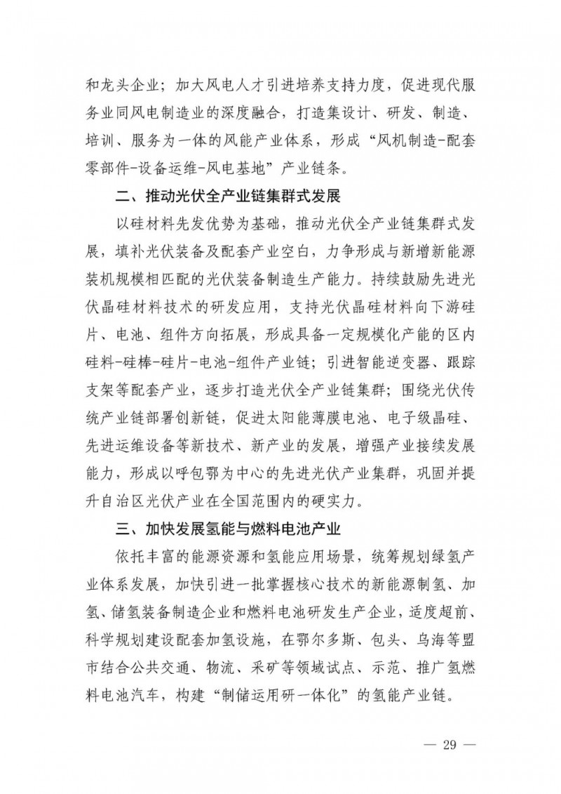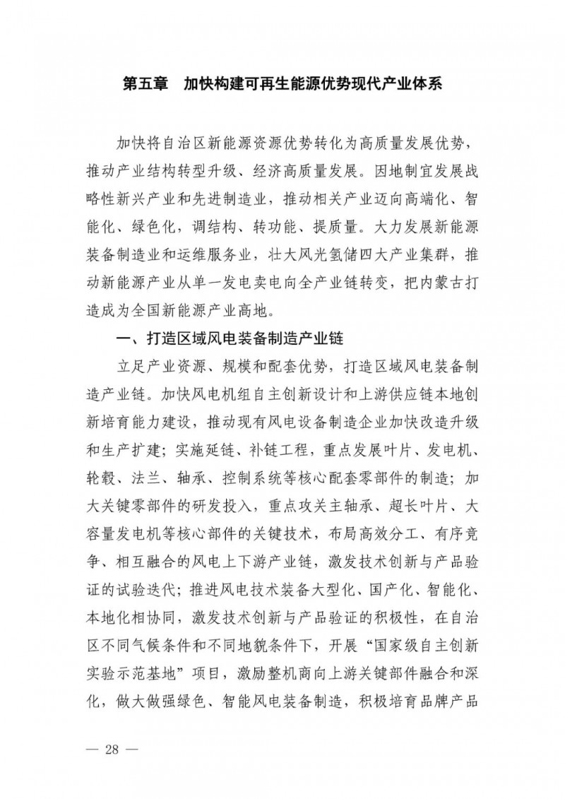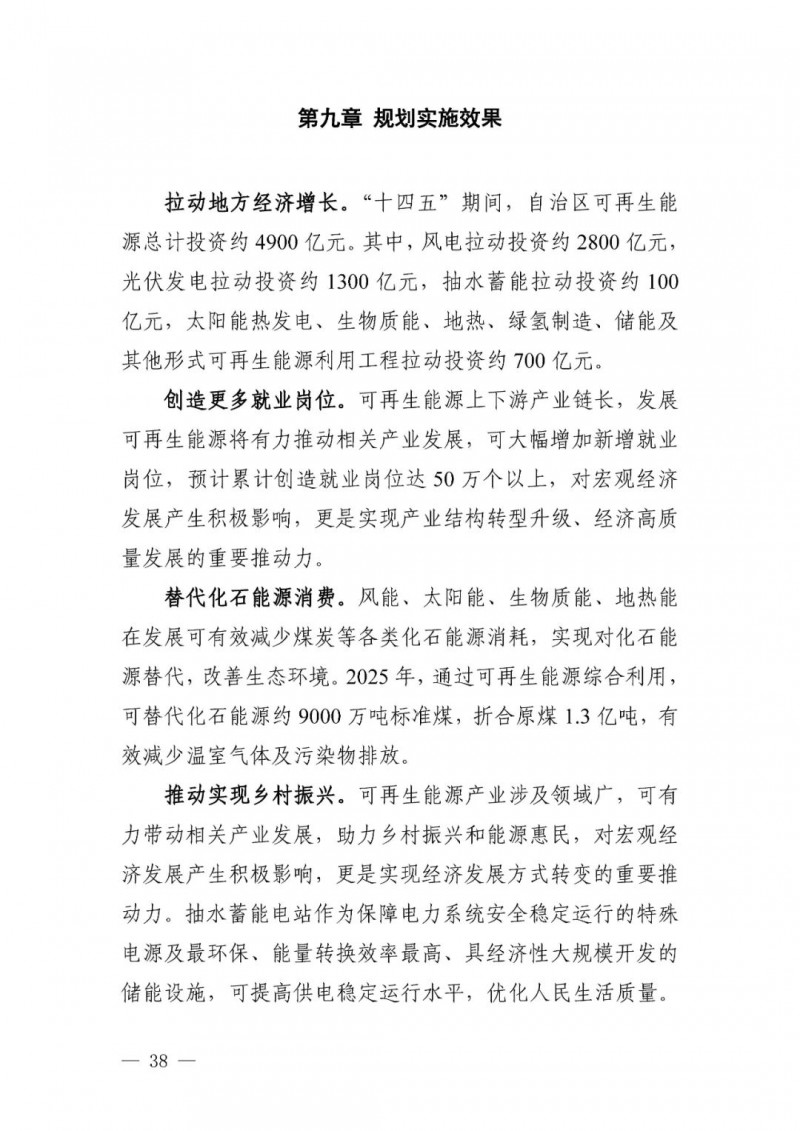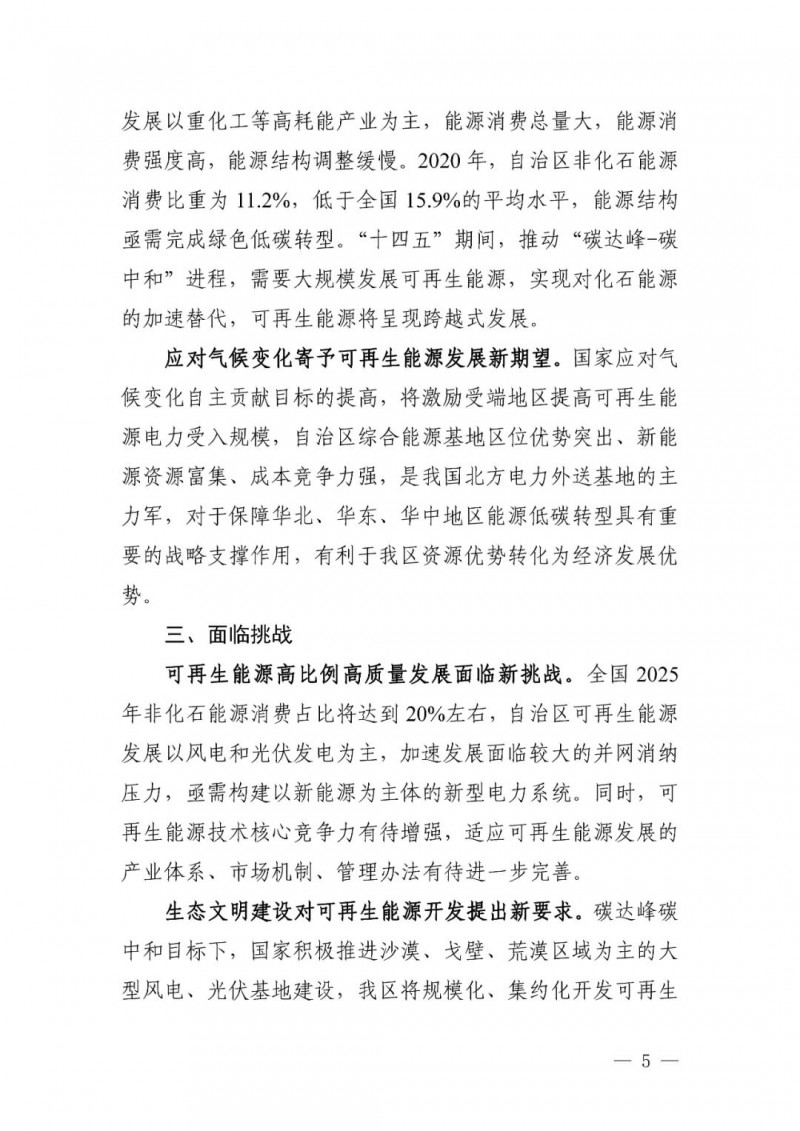 可再生能源發(fā)電目標。自治區(qū)可再生能源發(fā)電裝機達到 1.35 億千瓦以上,其中風電 8900 萬千瓦、光伏發(fā)電 4500 萬千瓦,新能源裝機規(guī)模超過燃煤火電裝機規(guī)模,新能源發(fā)電量占自治區(qū)總發(fā)電量比重超過35%。“十四五”期間可再生能源新增裝機 8000 萬千瓦以上,占全部新增裝機的比重超過 60%,成為新增裝機的主力。