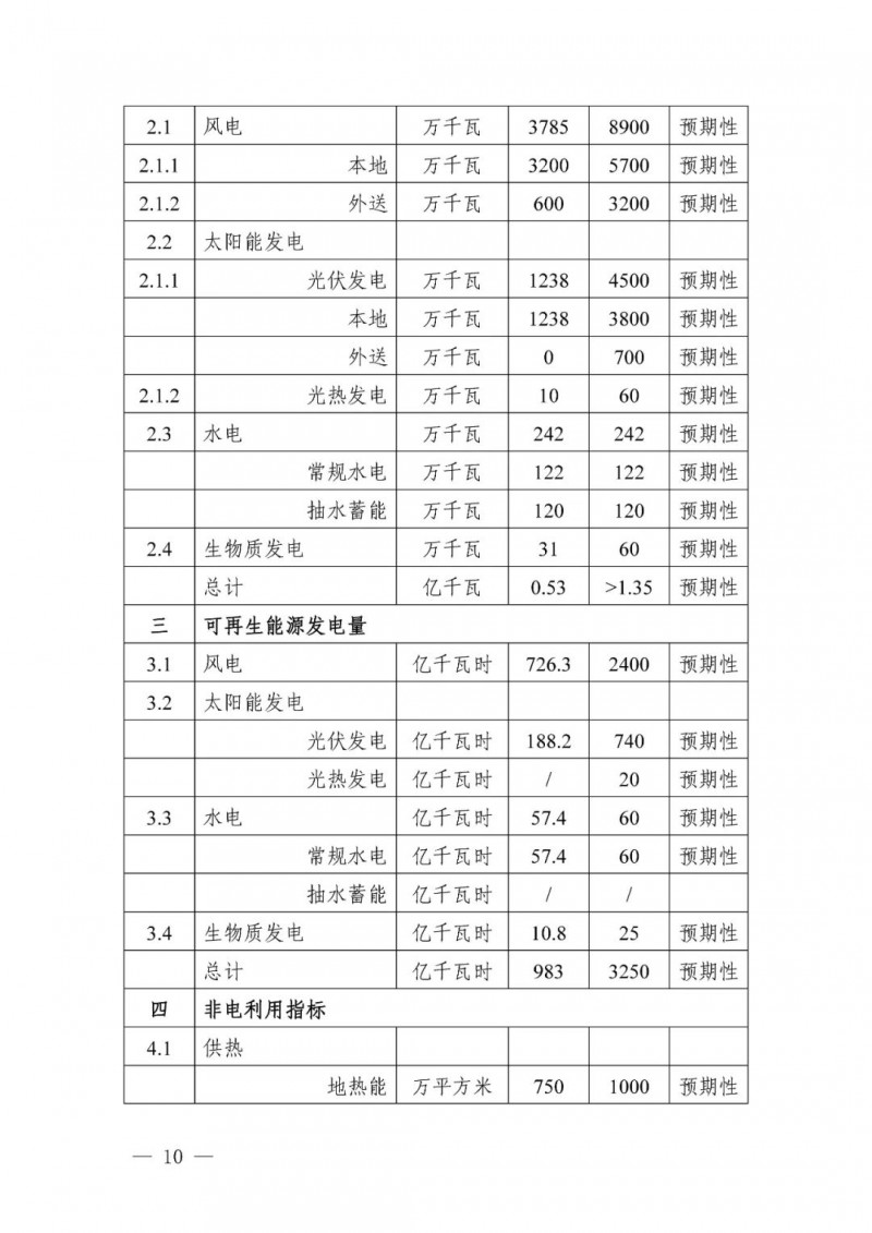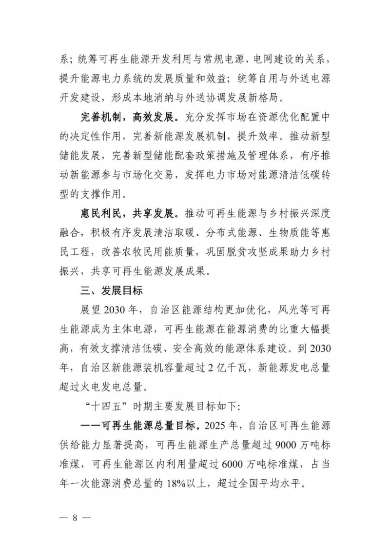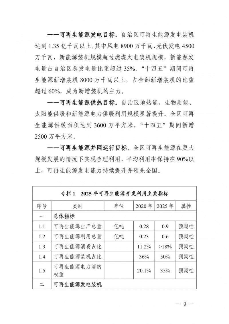 可再生能源總量目標。至2025 年,自治區(qū)可再生能源生產(chǎn)總量超過 9000萬噸標準煤,可再生能源區(qū)內(nèi)利用量超過6000萬噸標準煤,占當年一次能源消費總量的18%以上,超過全國平均水平。