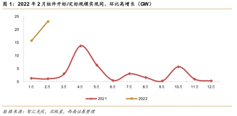 除同比爆發(fā)式增長外,如若著眼于月度間變化,我們認為2月需求表現(xiàn)持續(xù)向好。從總量來看,2月開標/定標規(guī)模達23.2GW,環(huán)比增長47.3%;從單項目規(guī)模上看,華電集團15GW組件集采大單具有較強代表性。