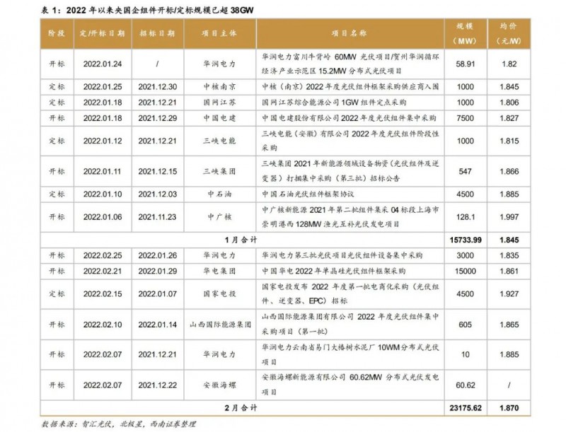 地面電站裝機需求釋放,央國企組件開標熱潮開啟。2021年12月上旬硅片庫存去化、產(chǎn)業(yè)鏈價格回落,地面電站的組件招標逐步啟動;疊加部分項目延期、補裝組件等因素,2022開年來終端需求呈現(xiàn)爆發(fā)式增長。根據(jù)我們統(tǒng)計,2022年1-2月,以央國企為主的組件開標/定標規(guī)模已達38.9GW??紤]到統(tǒng)計信息的不完全性,實際開標/定標規(guī)模有望達到40GW,終端需求表現(xiàn)強勢。