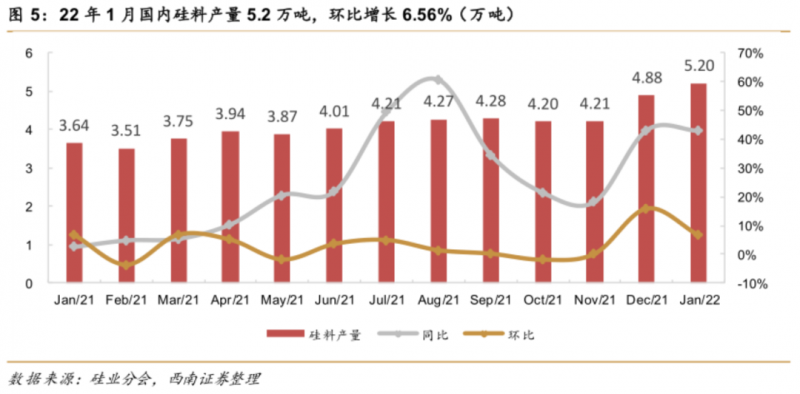 在終端需求的支撐下,產(chǎn)業(yè)鏈各環(huán)節(jié)開工率提升,1月產(chǎn)量創(chuàng)2021年以來歷史新高,帶動原材料需求增長。根據(jù)業(yè)內數(shù)據(jù),2022年1月國內硅片產(chǎn)量20.6GW,環(huán)比增加15.4%,產(chǎn)量Top5企業(yè)綜合開工率提升至70.45%,環(huán)比增長約2.6pp;電池片產(chǎn)量20.86GW,環(huán)比增長16.99%,主流電池企業(yè)綜合開工率達76.59%;組件產(chǎn)量19.73GW,環(huán)比增長23.31%,Top5組件企業(yè)綜合開工率68.11%,環(huán)比提升約10pp,也反向印證終端需求向好局面。各環(huán)節(jié)開工率提升直接帶動上游硅料-硅片原材料需求增長。