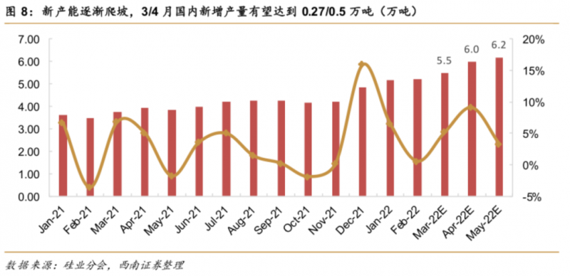 5月硅料產(chǎn)量有望在4月基礎上新增0.2萬噸。我們預計亞硅3萬噸新產(chǎn)能將于4月底滿產(chǎn),新特技改2萬噸(4月投產(chǎn))亦開始逐步貢獻增量,總供給將在4月的基礎上新增0.2萬噸。