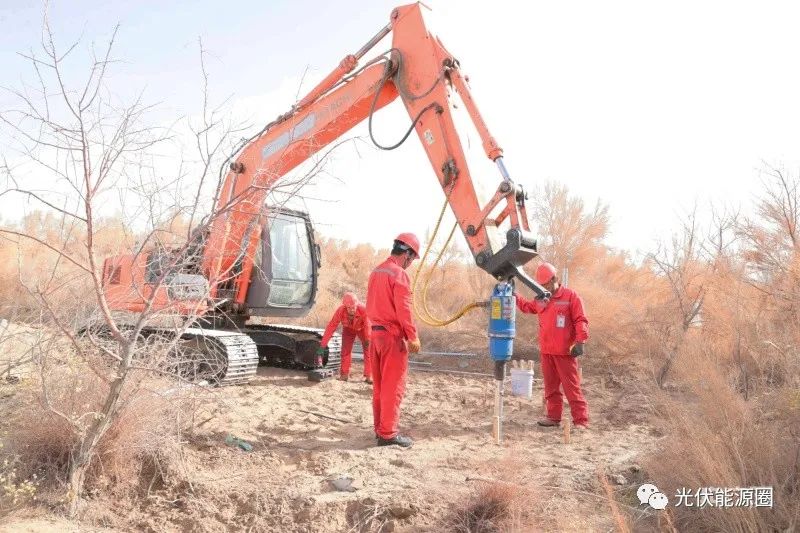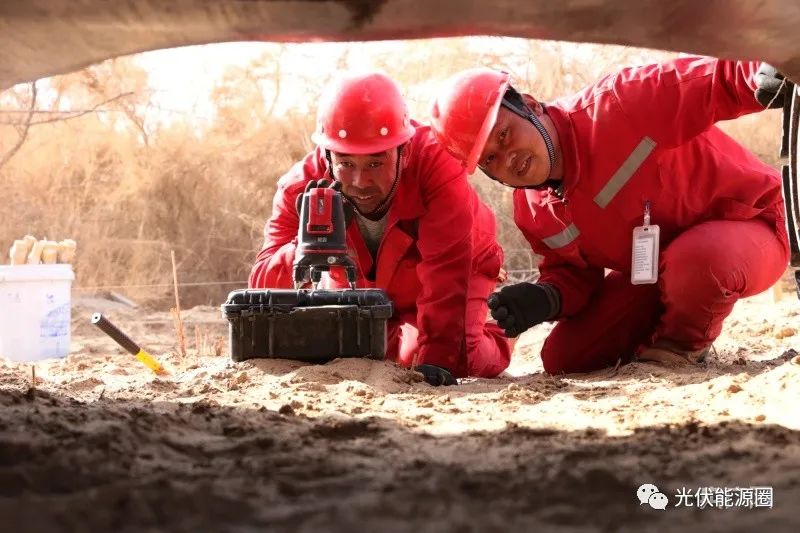在18號水井房,記者看到,組長李強(qiáng)正帶著三名工人給平整的場地打螺旋樁基礎(chǔ),為了保證后續(xù)安裝質(zhì)量,他們用激光水平儀、木樁、線繩在高低不平的沙地上找出水平線,然后用改裝的挖掘機(jī)將2.2米的螺旋樁按點(diǎn)位旋轉(zhuǎn)壓入地基。在挖掘機(jī)轟隆隆的嘶吼聲中,一個寬三米、長16.8米的安裝面20多分鐘就完成了。