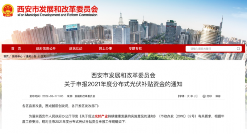 3月11日,陜西省西安市發(fā)改委發(fā)布關(guān)于申報(bào)2021年度分布式光伏補(bǔ)貼資金的通知。