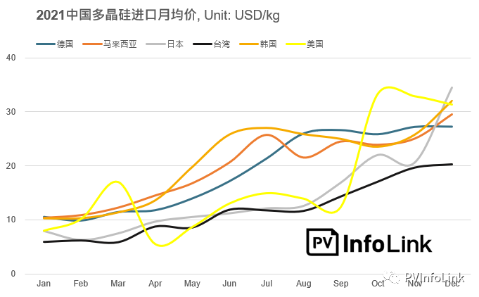多晶硅市場在2021年經(jīng)歷了較大的動蕩,因整體光伏供應鏈的產(chǎn)能錯配,使得硅料價格整年大都維持上漲態(tài)勢。除了中國國內(nèi)市場多晶硅交易價格上漲外,連帶使得價格相對平穩(wěn)的海外料價格也出現(xiàn)較大的波動,全年價格趨勢同樣呈現(xiàn)上升趨勢。PV Infolink透過統(tǒng)計2020 – 2021中國海關的多晶硅進口信息,分析變化原因與未來影響。