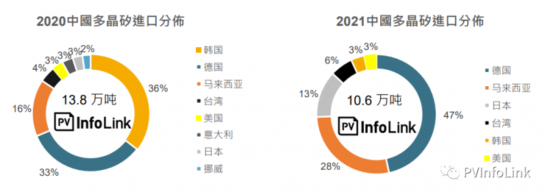 2021年進口多晶硅主要來自德國和馬來西亞,兩者占比達到了75%,主因兩國擁有瓦克和OCI兩家目前生產(chǎn)較為穩(wěn)定的非中國廠家。與2020年比較,出口多晶硅到中國的國家數(shù)量減少,且過去占據(jù)進口量第一名的韓國占比快速縮小,在韓國國內(nèi)生產(chǎn)設施目前沒有重啟的意愿下,預期未來占比將趨近于0%。其他來自日本或是臺灣的多晶硅進口,因該地區(qū)沒有多晶硅生產(chǎn)設施,可能是過去所簽訂的多晶硅長單未完全使用而轉售,但也僅有小量的占比。