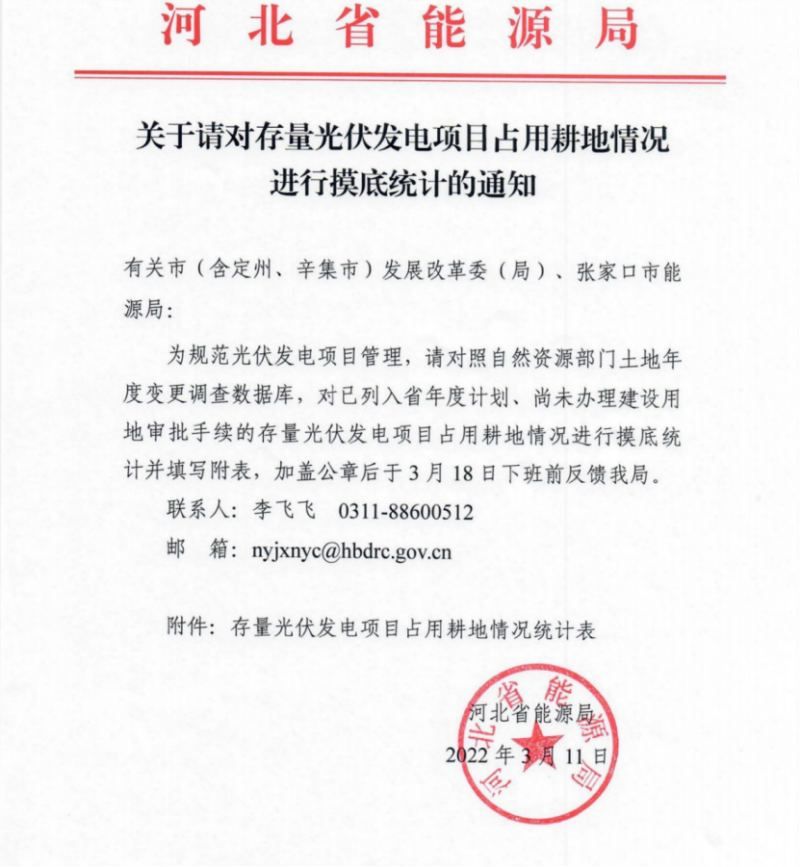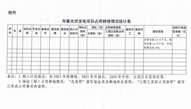 3月11日,河北省能源局啟動存量光伏電站占用耕地摸底統(tǒng)計工作,文件要求對照自然資源部門土地年度變更調(diào)查數(shù)據(jù)庫,對已列入省年度計劃、尚未辦理建設用地審批手續(xù)的存量光伏發(fā)電項目占用耕地情況進行摸底統(tǒng)計。附表信息統(tǒng)計中包括項目名稱、開發(fā)企業(yè)、備案證號、建設規(guī)模及地點、納入計劃批次以及場址總面積、已占用面積以及建設進度等多項詳細信息。