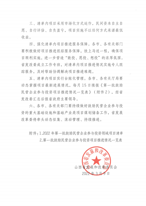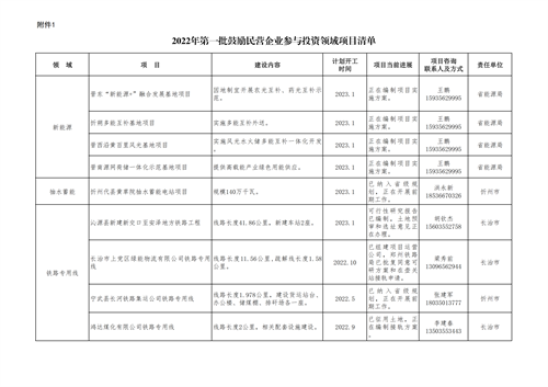 3月14日,山西省發(fā)改委關(guān)于發(fā)布2022年第一批鼓勵民營企業(yè)參與投資領(lǐng)域項目清單的通知,按照山西省委省政府關(guān)于實施市場主體倍增工程重要部署,為進(jìn)一步放寬民營企業(yè)市場準(zhǔn)入,鼓勵引導(dǎo)省內(nèi)外民間資本投資山西、建設(shè)山西,經(jīng)報請省政府同意,現(xiàn)將2022年第一批鼓勵民營企業(yè)參與投資領(lǐng)域項目清單(共50個項目,含打包項目)予以發(fā)布。本次發(fā)布的領(lǐng)域和項目主要面向民營企業(yè),所有項目(包含子項目)民企投資比例不得低于30%,此次在新能源領(lǐng)域中,共有4個項目入選。