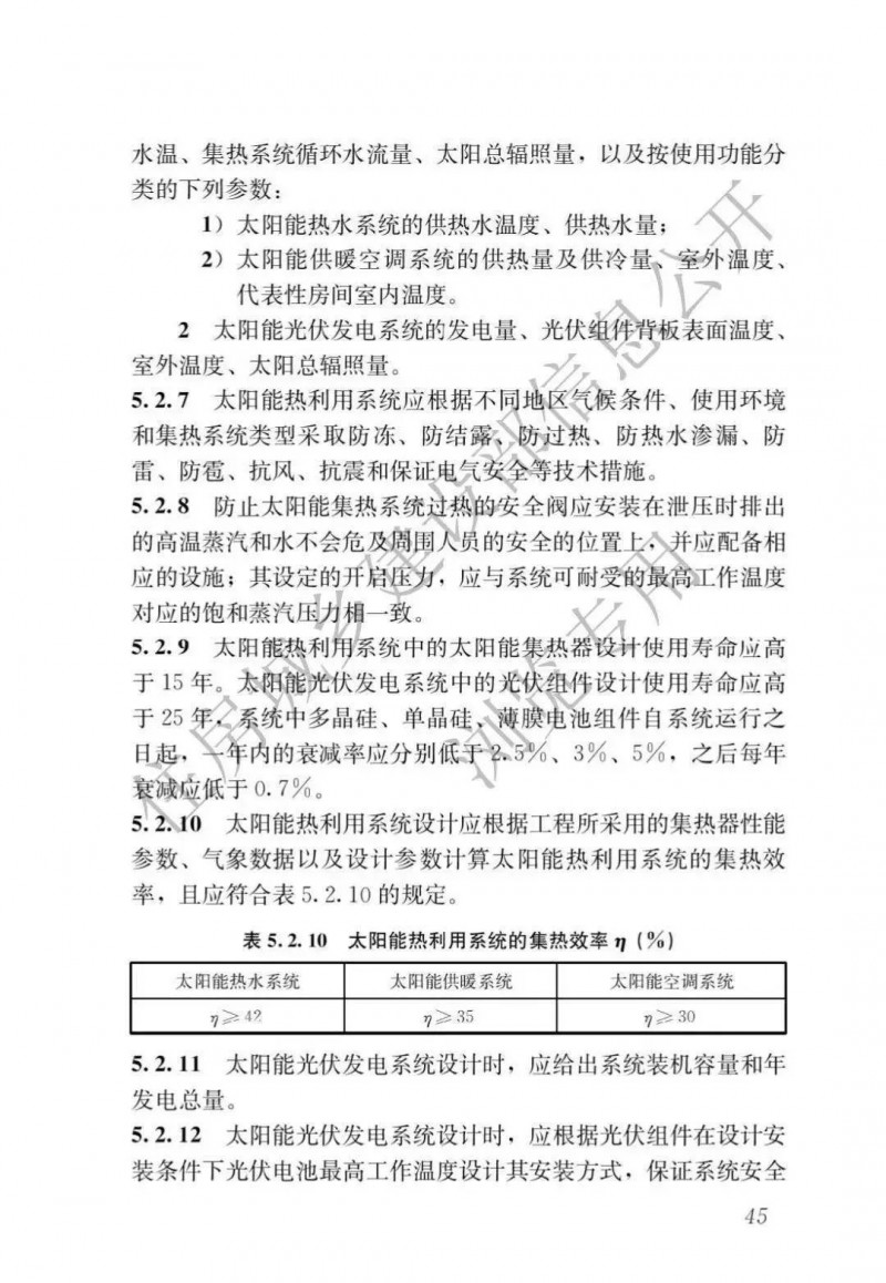 光伏:《規(guī)范》要求新建建筑應(yīng)安裝太陽(yáng)能系統(tǒng)。太陽(yáng)能熱利用系統(tǒng)中的太陽(yáng)能集熱器設(shè)計(jì)使用壽命應(yīng)高于15年。太陽(yáng)能光伏發(fā)電系統(tǒng)中的光伏組件設(shè)計(jì)使用壽命應(yīng)高于25年,系統(tǒng)中多晶硅、單晶硅、薄膜電池組件自系統(tǒng)運(yùn)行之日起,十年內(nèi)的衰減率應(yīng)分別低于2.5%、3%、5%,之后每年衰減應(yīng)低于0.7%。