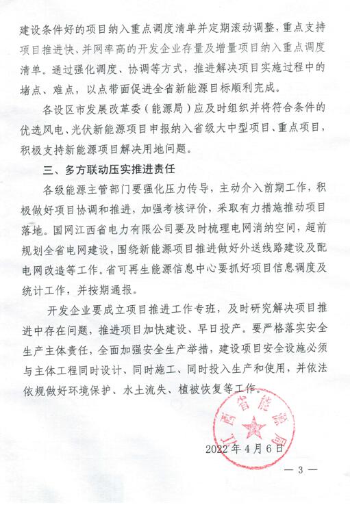 2022年4月6日,江西省能源局就加快我省新能源項(xiàng)目建設(shè)有關(guān)事項(xiàng)進(jìn)行了通知,通知包含以下內(nèi)容:1.加快推進(jìn)新能源項(xiàng)目建設(shè);2.建立重點(diǎn)項(xiàng)目調(diào)度機(jī)制;3.多方聯(lián)動(dòng)壓實(shí)推進(jìn)責(zé)任。