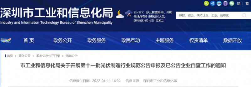 深圳工信局:開展第十一批光伏制造行業(yè)規(guī)范公告申報(bào)及已公告企業(yè)自查工作