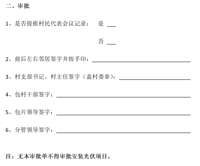 近日,山東地區(qū)某鄉(xiāng)鎮(zhèn)一位Y姓光伏從業(yè)者向索比光伏網(wǎng)爆料稱,當?shù)厮泄夥椖可陥筮^程均需填寫《安裝方案審批單》。從他提供的截圖看,一個戶用光伏系統(tǒng)的安裝,在進入當?shù)毓╇娋种?,需?步才能完成:
