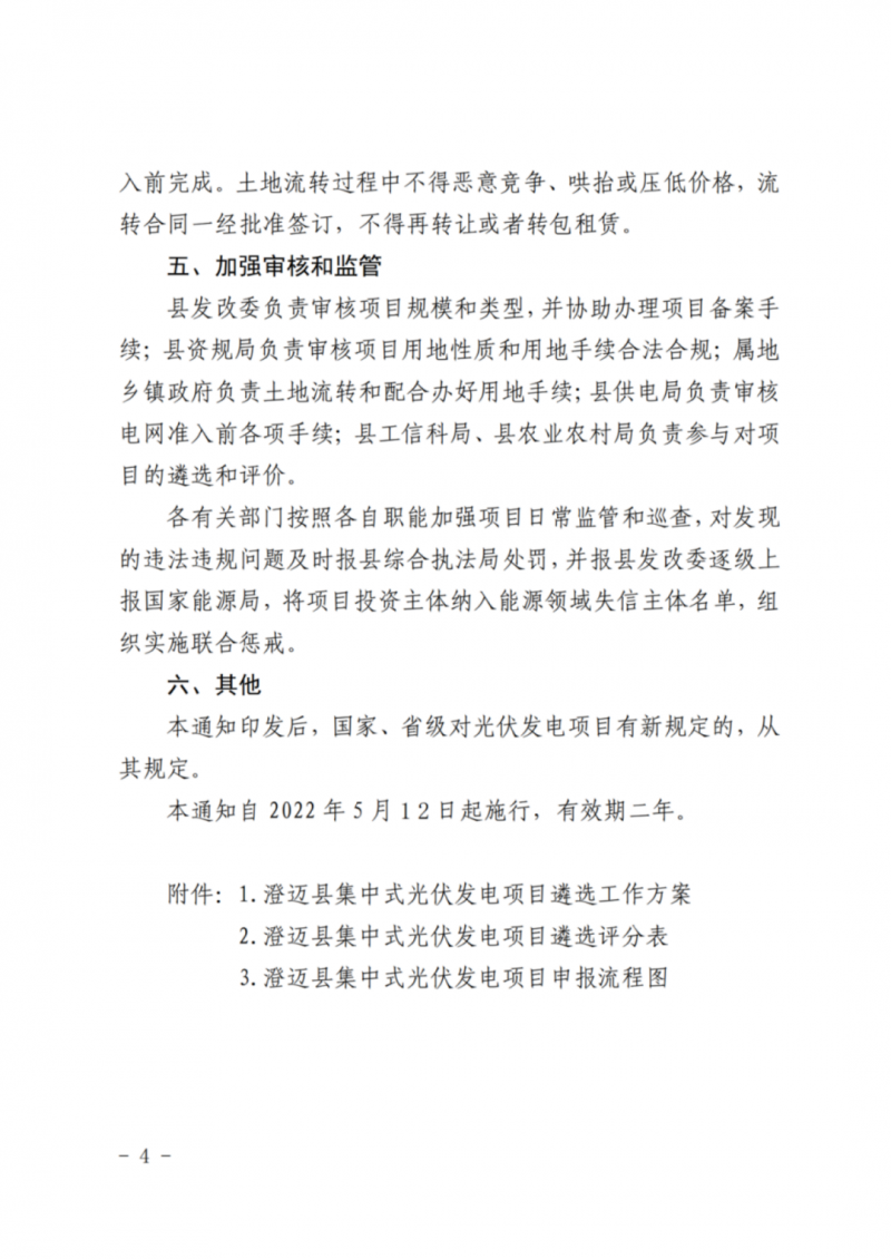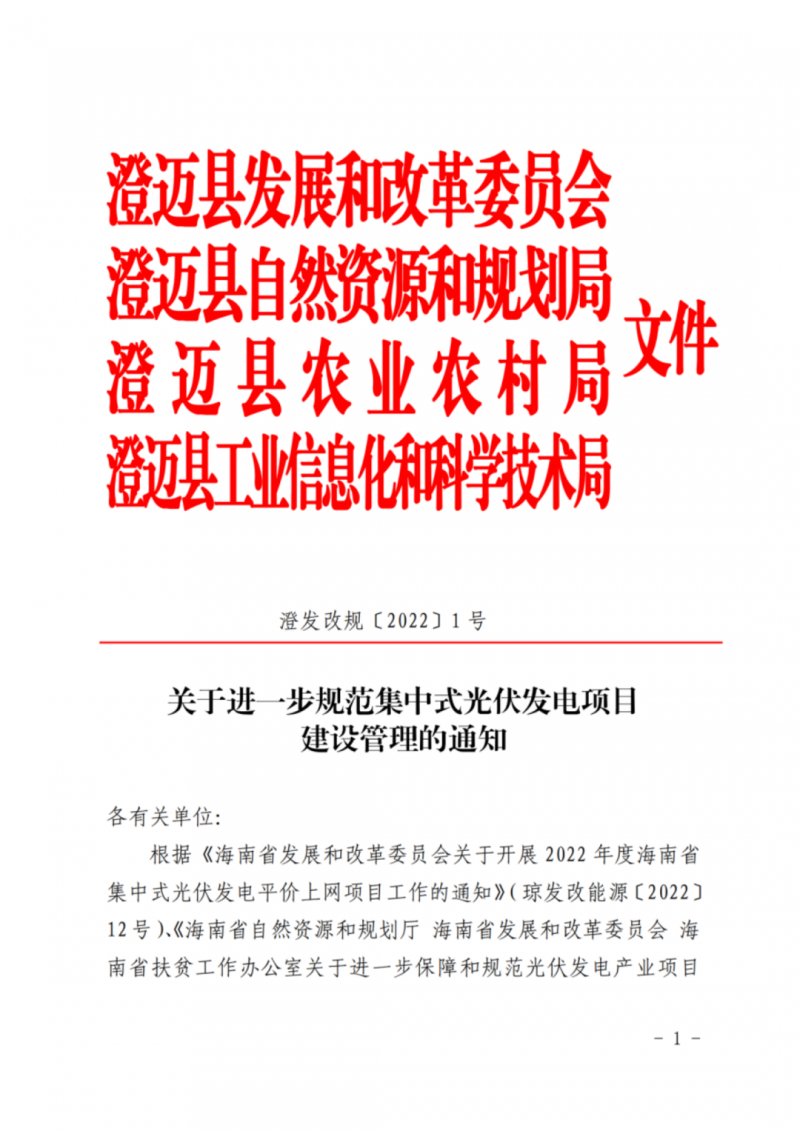 4月11日,澄邁縣發(fā)展和改革委員會、澄邁縣自然資源和規(guī)劃局、澄邁縣農(nóng)業(yè)農(nóng)村局、澄邁縣工業(yè)信息化和科學(xué)技術(shù)局聯(lián)合發(fā)布了《關(guān)于進(jìn)一步規(guī)范集中式光伏發(fā)電項(xiàng)目建設(shè)管理的通知》。本通知自2022年5月12日起施行,有效期2年。