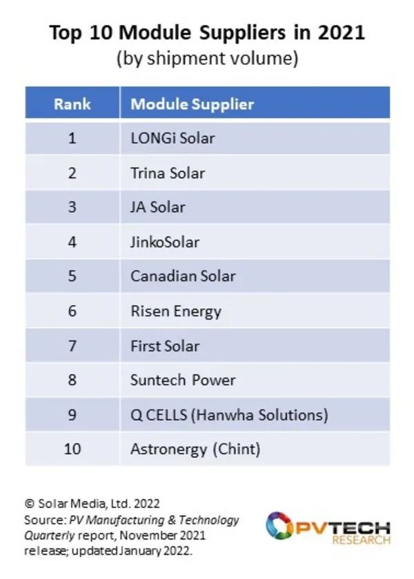 2022年一季度全球光伏組件供應(yīng)商排行榜揭曉!這家中國企業(yè)重返全球第一