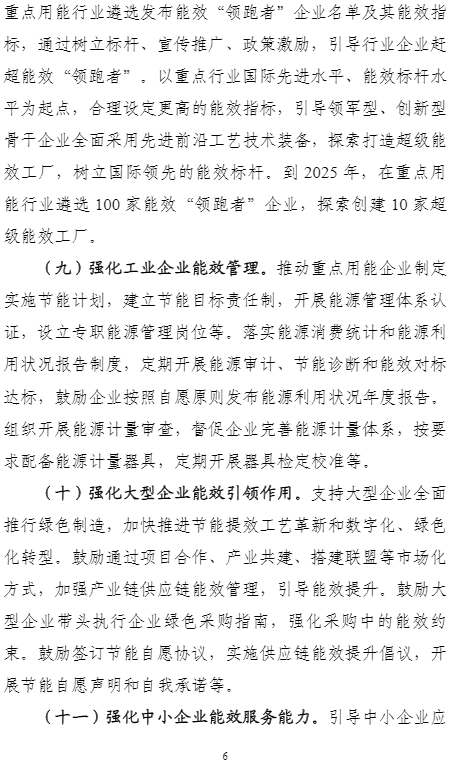 計劃提出,到2025年,重點工業(yè)行業(yè)能效全面提升,數(shù)據(jù)中心等重點領(lǐng)域能效明顯提升,綠色低碳能源利用比例顯著提高,節(jié)能提效工藝技術(shù)裝備廣泛應(yīng)用,標準、服務(wù)和監(jiān)管體系逐步完善,鋼鐵、石化化工、有色金屬、建材等行業(yè)重點產(chǎn)品能效達到國際先進水平,規(guī)模以上工業(yè)單位增加值能耗比2020年下降13.5%。能盡其用、效率至上成為市場主體和公眾的共同理念和普遍要求,節(jié)能提效進一步成為綠色低碳的“第一能源”和降耗減碳的首要舉措。