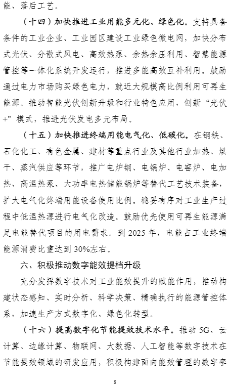 加快推進終端用能電氣化、低碳化。在鋼鐵、石化化工、有色金屬、建材等重點行業(yè)及其他行業(yè)加熱、烘干、蒸汽供應(yīng)等環(huán)節(jié),推廣電爐鋼、電鍋爐、電窯爐、電加熱、高溫?zé)岜谩⒋蠊β孰姛醿δ苠仩t等替代工藝技術(shù)裝備,擴大電氣化終端用能設(shè)備使用比例。穩(wěn)妥有序?qū)I(yè)生產(chǎn)過程中低溫?zé)嵩催M行電氣化改造。鼓勵優(yōu)先使用可再生能源滿足電能替代項目的用電需求。到2025年,電能占工業(yè)終端能源消費比重達到30%左右。