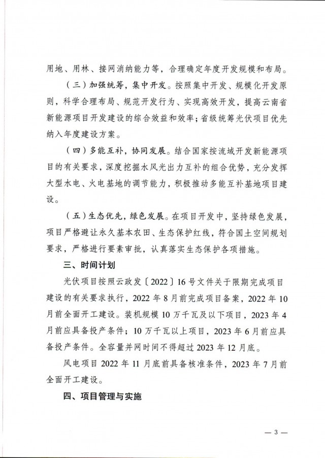 在時(shí)間計(jì)劃上,光伏項(xiàng)目按照2022年8月前完成項(xiàng)目備案,2022年10月前全面開(kāi)工建設(shè)。裝機(jī)規(guī)模10萬(wàn)千瓦及以下項(xiàng)目,2023年4月前應(yīng)具備投產(chǎn)條件;10萬(wàn)千瓦以上項(xiàng)目,2023年6月前應(yīng)具備投產(chǎn)條件。全容量并網(wǎng)時(shí)間不得超過(guò)2023年12月底。風(fēng)電項(xiàng)目2022年11月底前具備核準(zhǔn)條件,2023年7月前全面開(kāi)工建設(shè)。