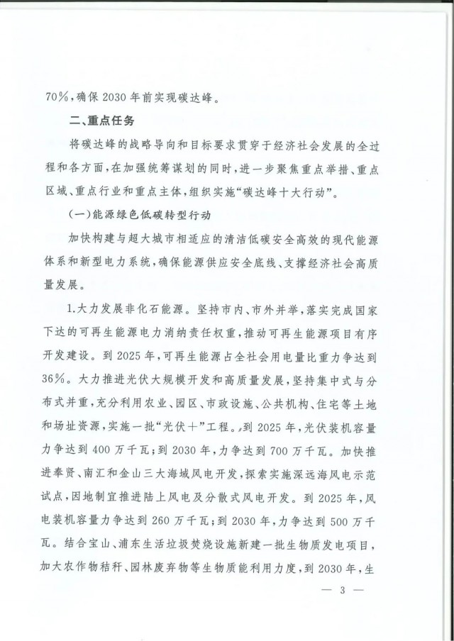 能源綠色低碳轉(zhuǎn)型行動提出,到2025年,可再生能源占全社會用電量比重力爭達(dá)到36%。堅(jiān)持集中式與分布式并重,實(shí)施一批“光伏+“工程。到2025年,光伏裝機(jī)容量力爭達(dá)到400萬千瓦;到2030年,力爭達(dá)到700萬千瓦。加快推進(jìn)奉賢、南匯和金山三大海域風(fēng)電開發(fā),探索實(shí)施深遠(yuǎn)海風(fēng)電示范試點(diǎn),因地制宜推進(jìn)陸上風(fēng)電及分散式風(fēng)電開發(fā)。到2025年,風(fēng)電裝機(jī)容量力爭達(dá)到260萬千瓦;到2030年,力爭達(dá)到500萬千瓦。結(jié)合寶山、浦東生活垃圾焚燒設(shè)施新建一批生物質(zhì)發(fā)電項(xiàng)目,到2030年,生物質(zhì)發(fā)電裝機(jī)容量達(dá)到84萬千瓦。
