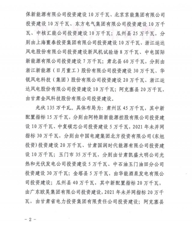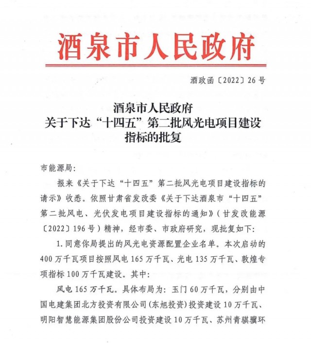 7月22日,甘肅酒泉市人民政府下發(fā)“十四五”第二批風(fēng)光項目建設(shè)指標的批復(fù),按照風(fēng)電1.65GW、光伏1.35GW以及敦煌1GW專項指標劃分,規(guī)??傆嫗?GW,光伏、風(fēng)電總規(guī)模各為2GW。