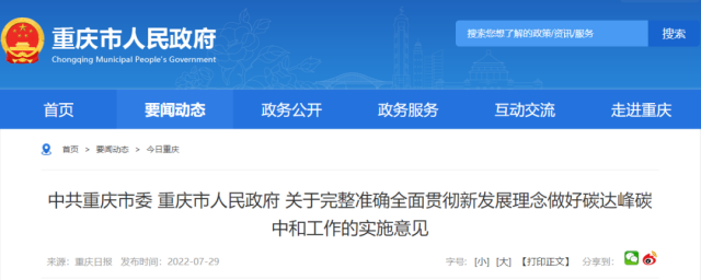 7月29日,中共重慶市委、重慶市人民政府出臺(tái)關(guān)于完整準(zhǔn)確全面貫徹新發(fā)展理念做好碳達(dá)峰碳中和工作的實(shí)施意見(以下簡稱“意見”)。