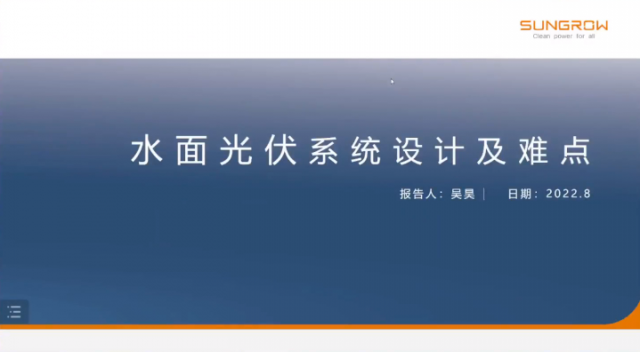陽光水面光伏科技有限公司產(chǎn)品中心總監(jiān)吳昊作水面漂浮系統(tǒng)技術(shù)難點(diǎn)與分析。吳總監(jiān)全面講解了水面光伏的優(yōu)勢(shì),水面光伏系統(tǒng)設(shè)計(jì)及難點(diǎn),并分享了一些典型案例經(jīng)驗(yàn)。