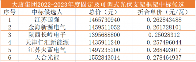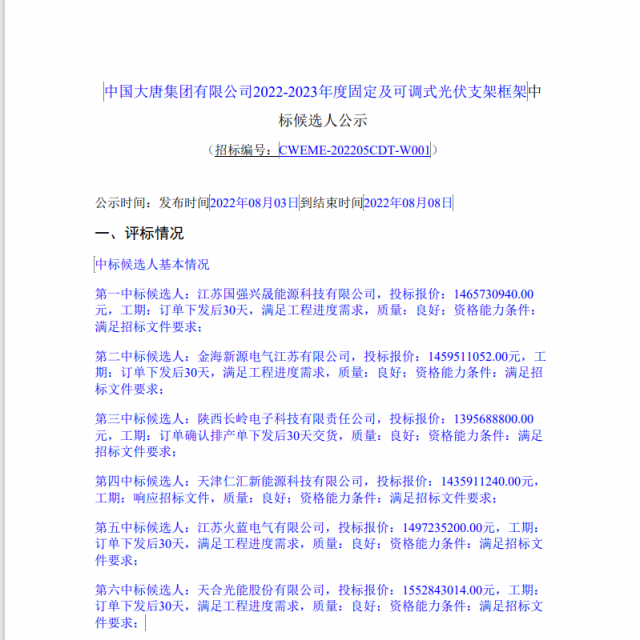 8月3日,大唐集團公示了2022-2023年度固定及可調(diào)式光伏支架框架中標(biāo)候選人,江蘇國強興晟能源、金海新源電氣、陜西長嶺電子科技、天津仁匯新能源、江蘇火藍(lán)電氣、天合光能6家光伏支架供應(yīng)商入圍。