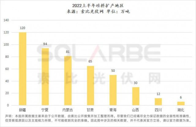 ●為填補(bǔ)供應(yīng)缺口,2022年上半年,有不少于19家企業(yè)發(fā)布硅料擴(kuò)產(chǎn)計(jì)劃,擴(kuò)產(chǎn)總量達(dá)458萬噸(多晶硅269萬噸,工業(yè)硅189萬噸),投資金額超1620億,擴(kuò)產(chǎn)多集中在新疆、內(nèi)蒙古、寧夏、四川等地。