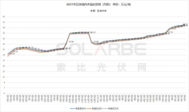 這一勢(shì)頭也為硅料環(huán)節(jié)敲響了警鐘,2021年中,供需失衡導(dǎo)致硅料價(jià)格不斷暴漲至今,單晶復(fù)投料從去年年初的8.76萬元/噸,到今天30.22萬元/噸,漲幅245%;單晶致密料從8.5萬元/噸到30萬元/噸,漲幅253%;單晶菜花料從8.2萬元/噸到29.72萬元/噸,漲幅262%。