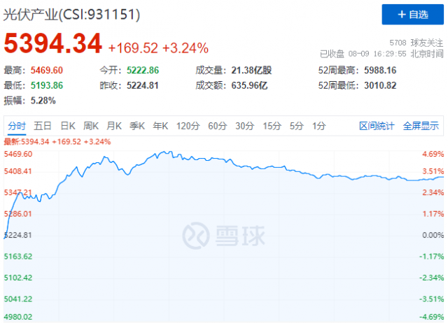 8月9日,調(diào)整一周有余的光伏板塊迎來(lái)全線反彈,個(gè)股呈現(xiàn)普漲態(tài)勢(shì),中證光伏產(chǎn)業(yè)指數(shù)(CSI:931151)大漲3.24%,報(bào)收5394點(diǎn)。值得注意的是,近幾個(gè)交易日股價(jià)表現(xiàn)強(qiáng)勢(shì)的部分電池片概念股早盤出現(xiàn)沖高回落的情況,而近期股價(jià)表現(xiàn)較為萎靡的硅片等產(chǎn)業(yè)鏈上游個(gè)股卻集體大漲。