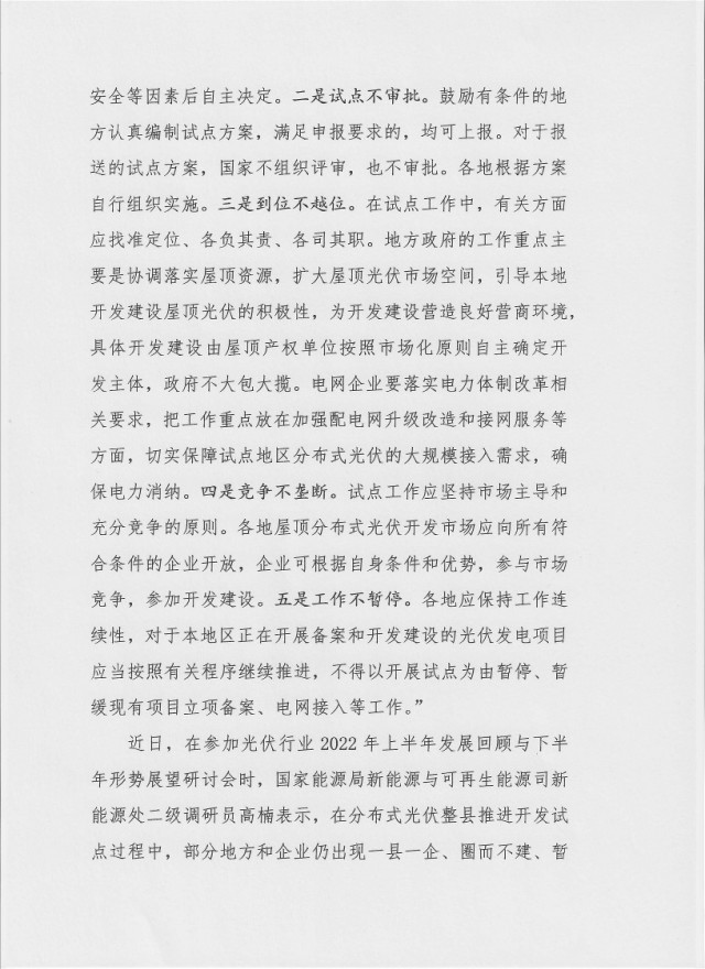 啟動(dòng)整縣(市、區(qū))推進(jìn)屋頂分布式光伏開(kāi)發(fā)試點(diǎn)工作,主要目的就是充分調(diào)動(dòng)和發(fā)揮地方積極性,引導(dǎo)地方政府協(xié)調(diào)更多屋頂資源,進(jìn)一步開(kāi)拓市場(chǎng),擴(kuò)大屋頂分布式光伏的建設(shè)規(guī)模。去年,國(guó)家能源局提出“在開(kāi)展整縣(市、區(qū))推進(jìn)屋頂分布式光伏開(kāi)發(fā)試點(diǎn)工作中需要著重把握以下五個(gè)方面:一是自愿不強(qiáng)制。各地是否開(kāi)展試點(diǎn)以及開(kāi)展多少個(gè)試點(diǎn)由各地根據(jù)自身實(shí)際情況自己決定,不搞行政命令。建筑屋頂是否開(kāi)展建設(shè),由屋頂產(chǎn)權(quán)單位綜合考慮屋頂承重、安全等因素后自主決定。二是試點(diǎn)不審批。鼓勵(lì)有條件的地方認(rèn)真編制試點(diǎn)方案,滿足申報(bào)要求的,均可上報(bào)。對(duì)于報(bào)送的試點(diǎn)方案,國(guó)家不組織評(píng)審,也不審批。各地根據(jù)方案自行組織實(shí)施。三是到位不越位。在試點(diǎn)工作中,有關(guān)方面應(yīng)找準(zhǔn)定位、各負(fù)其責(zé)、各司其職。地方政府的工作重點(diǎn)主要是協(xié)調(diào)落實(shí)屋頂資源,擴(kuò)大屋頂光伏市場(chǎng)空間,引導(dǎo)本地開(kāi)發(fā)建設(shè)屋頂光伏的積極性,為開(kāi)發(fā)建設(shè)營(yíng)造良好營(yíng)商環(huán)境,具體開(kāi)發(fā)建設(shè)由屋頂產(chǎn)權(quán)單位按照市場(chǎng)化原則自主確定開(kāi)發(fā)主體,政府不大包大攬。電網(wǎng)企業(yè)要落實(shí)電力體制改革相關(guān)要求,把工作重點(diǎn)放在加強(qiáng)配電網(wǎng)升級(jí)改造和接網(wǎng)服務(wù)等方面,切實(shí)保障試點(diǎn)地區(qū)分布式光伏的大規(guī)模接入需求,確保電力消納。四是競(jìng)爭(zhēng)不壟斷。試點(diǎn)工作應(yīng)堅(jiān)持市場(chǎng)主導(dǎo)和充分競(jìng)爭(zhēng)的原則。各地屋頂分布式光伏開(kāi)發(fā)市場(chǎng)應(yīng)向所有符合條件的企業(yè)開(kāi)放,企業(yè)可根據(jù)自身?xiàng)l件和優(yōu)勢(shì),參與市場(chǎng)競(jìng)爭(zhēng),參加開(kāi)發(fā)建設(shè)。五是工作不暫停。各地應(yīng)保持工作連續(xù)性,對(duì)于本地區(qū)正在開(kāi)展備案和開(kāi)發(fā)建設(shè)的光伏發(fā)電項(xiàng)目應(yīng)當(dāng)按照有關(guān)程序繼續(xù)推進(jìn),不得以開(kāi)展試點(diǎn)為由暫停、暫緩現(xiàn)有項(xiàng)目立項(xiàng)備案、電網(wǎng)接入等工作?!?/p>