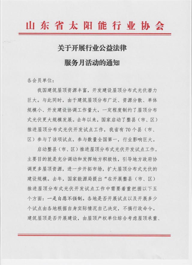 山東省太陽(yáng)能行業(yè)協(xié)會(huì):關(guān)于開(kāi)展行業(yè)公益法律服務(wù)月活動(dòng)的通知