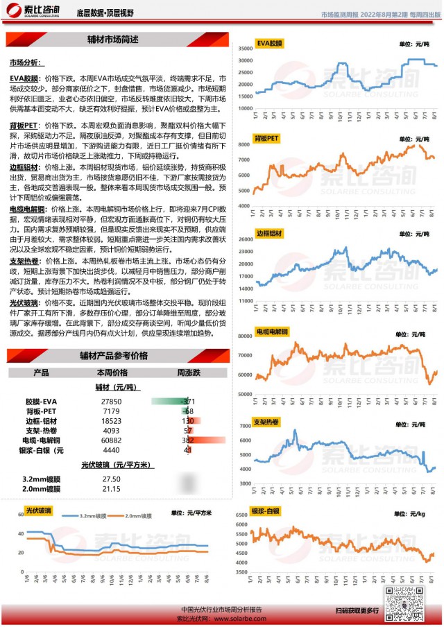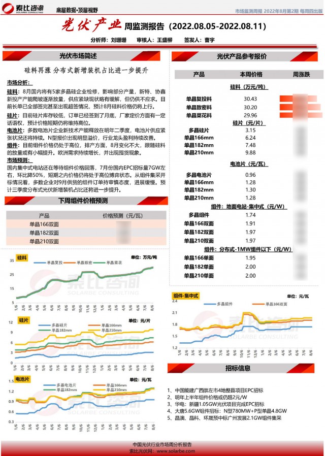 光伏產(chǎn)業(yè)周監(jiān)測報告系索比咨詢對于光伏產(chǎn)業(yè)鏈上下游價格的監(jiān)測與預(yù)報,幫助企業(yè)獲得最實(shí)時的參考價格。每周除了對硅料、硅片、電池片、組件、輔材等價格進(jìn)行追蹤和分析外,亦關(guān)注下游招標(biāo)動態(tài),并對后續(xù)市場趨勢做出研判。