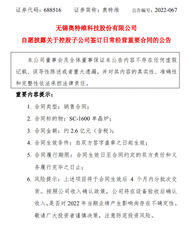 近日,奧特維發(fā)布公告稱,公司控股子公司無錫松瓷機(jī)電有限公司(以下簡(jiǎn)稱“松瓷機(jī)電”)近日與天合光能(青海)晶硅有限公司簽訂《采購合同》,松瓷機(jī)電向天合光能(青海)晶硅有限公司銷售SC-1600單晶爐,合同金額約2.6億元(含稅)。