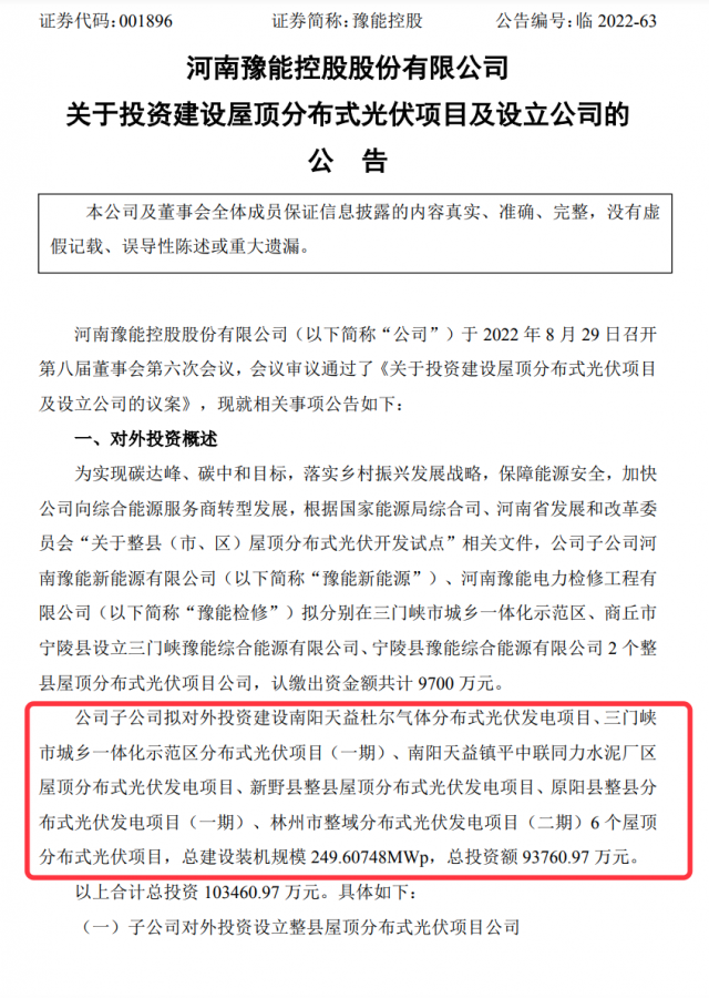 其中,豫能控股子公司豫能新能源、豫能檢修擬分別在三門峽市城鄉(xiāng)一體化示范區(qū)、商丘市寧陵縣設(shè)立三門峽豫能綜合能源有限公司、寧陵縣豫能綜合能源有限公司2個整縣屋頂分布式光伏項(xiàng)目公司,認(rèn)繳出資金額共計9700萬元。