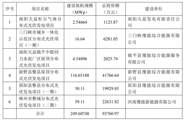 此外,豫能控股子公司擬對外投資建設(shè)南陽天益杜爾氣體分布式光伏發(fā)電項(xiàng)目、三門峽市城鄉(xiāng)一體化示范區(qū)分布式光伏項(xiàng)目(一期)、南陽天益鎮(zhèn)平中聯(lián)同力水泥廠區(qū)屋頂分布式光伏發(fā)電項(xiàng)目、新野縣整縣屋頂分布式光伏發(fā)電項(xiàng)目、原陽縣整縣分布式光伏發(fā)電項(xiàng)目(一期)、林州市整域分布式光伏發(fā)電項(xiàng)目(二期)6個屋頂分布式光伏項(xiàng)目。