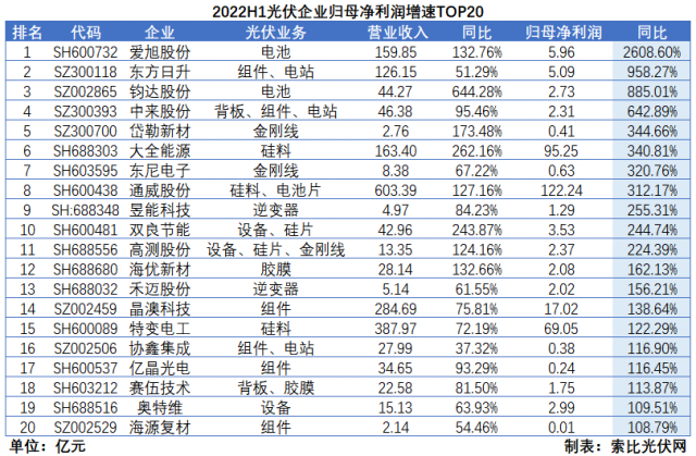 利潤(rùn)增速方面,除了硅料企業(yè)延續(xù)高增長(zhǎng)以外,去年因硅料價(jià)格暴漲而出現(xiàn)虧損的產(chǎn)業(yè)鏈中游專業(yè)化廠商,2022年上半年受益于供應(yīng)鏈管理能力的提升以及產(chǎn)品結(jié)構(gòu)的優(yōu)化,紛紛迎來困境翻轉(zhuǎn),其中愛旭股份、東方日升、中來股份的利潤(rùn)增速分別達(dá)到2609%、958%和643%。此外,岱勒新材、東尼電子兩大金剛線廠商受益于硅片環(huán)節(jié)的擴(kuò)產(chǎn)以及細(xì)線化發(fā)展趨勢(shì),疊加自身的產(chǎn)能擴(kuò)張和成本下降,利潤(rùn)增速均超300%。
