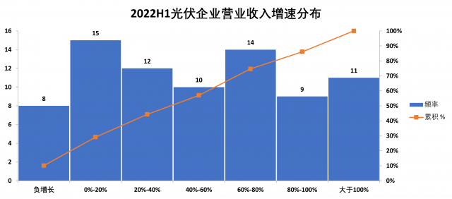 2022年上半年,79家光伏企業(yè)合計(jì)創(chuàng)收5571億元,平均增速(“平均”指“中位數(shù)”,下同)達(dá)到48%。令人欣喜的是,營(yíng)收負(fù)增長(zhǎng)的企業(yè)占比僅為10%,而營(yíng)收增速超過40%的企業(yè)占比則高達(dá)71%。其中,除了硅料企業(yè)繼續(xù)保持高速增長(zhǎng)以外,眾多“跨界者”也乘著光伏行業(yè)的“東風(fēng)”,迎來暴發(fā)式增長(zhǎng)。