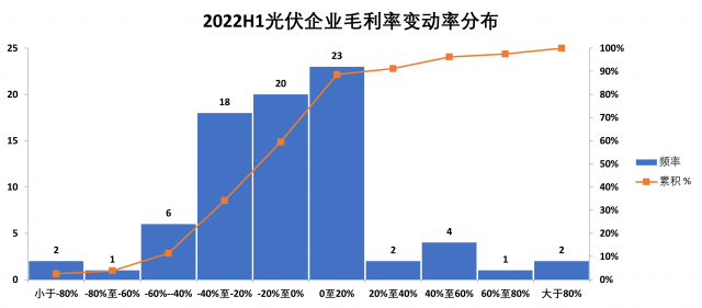 雖然2022年上半年光伏行業(yè)依然延續(xù)了高速增長(zhǎng)態(tài)勢(shì),多數(shù)光伏企業(yè)也取得了不錯(cuò)的經(jīng)營(yíng)業(yè)績(jī),但受到原材料價(jià)格大幅上漲、供需關(guān)系變化以及市場(chǎng)競(jìng)爭(zhēng)加劇等因素的影響,多數(shù)光伏企業(yè)的毛利率相比于去年同期均出現(xiàn)了不同程度的下滑。根據(jù)索比光伏網(wǎng)的統(tǒng)計(jì),79家光伏企業(yè)的毛利率平均降幅達(dá)到8.94%,而降幅超過20%的企業(yè)占比更是高達(dá)34%。