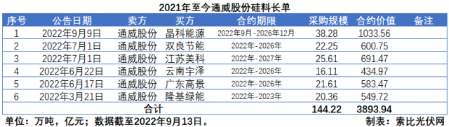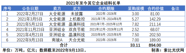 除了硅料三巨頭以外,大全能源、亞洲硅業(yè)兩大老牌硅料廠商分別取得了規(guī)模達(dá)到16.09萬噸和10.02萬噸、合約價(jià)值434.43億元和270.57億元的長(zhǎng)單。而就在昨天,南玻集團(tuán)宣布與天合光能達(dá)成價(jià)值212.10億元的4年7萬噸長(zhǎng)約。
