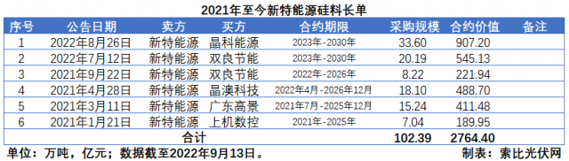 新特能源長(zhǎng)單規(guī)模達(dá)到102.39萬噸,合約價(jià)值2764.40億元,主要客戶有晶科能源、晶澳科技、上機(jī)數(shù)控、雙良節(jié)能等。值得注意的是,公司分別與晶科能源和雙良節(jié)能簽下了持續(xù)至2030年的8年長(zhǎng)約,僅次于10多年前無錫尚德等組件龍頭簽下的10年長(zhǎng)約。