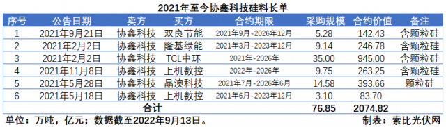 協(xié)鑫科技長(zhǎng)單規(guī)模達(dá)到76.85萬噸,合約價(jià)值2074.82億元,主要客戶包括硅片寡頭TCL中環(huán)、硅片新勢(shì)力上機(jī)數(shù)控和雙良節(jié)能,以及隆基綠能、晶澳科技等一體化組件巨頭。值得一提的是,公司多數(shù)長(zhǎng)單中均包含了顆粒硅產(chǎn)品,市場(chǎng)認(rèn)可度愈發(fā)提升。憑借顆粒硅低成本、低碳排等優(yōu)勢(shì),協(xié)鑫科技有望構(gòu)筑成本壁壘并形成差異化競(jìng)爭(zhēng)優(yōu)勢(shì)。