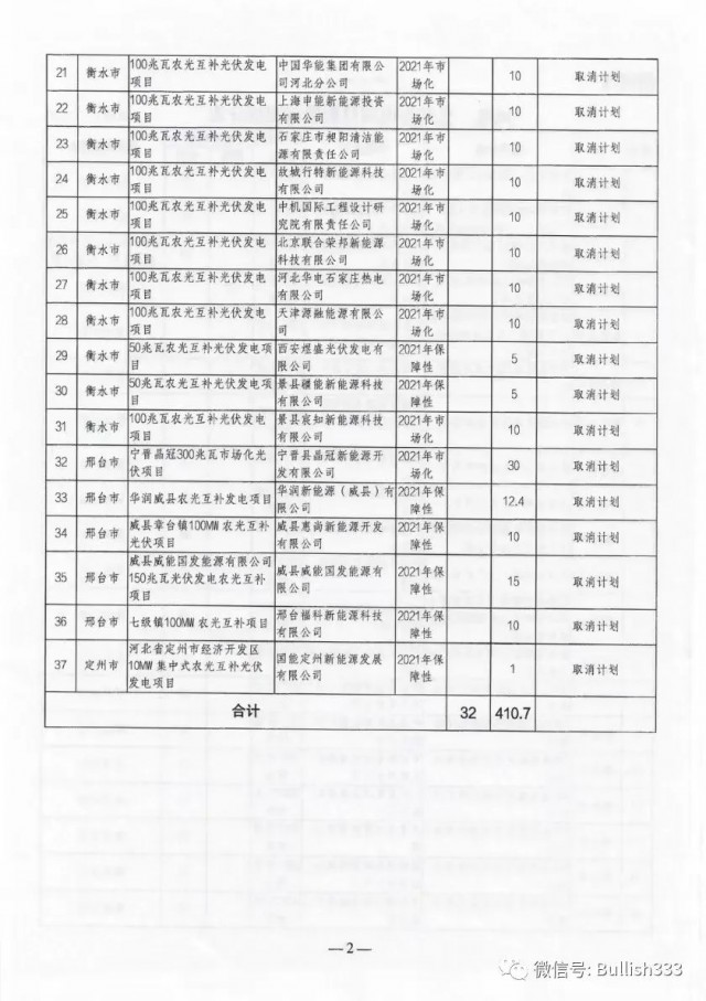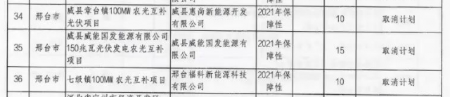 根據(jù)文件來看,相比此前發(fā)布的《風(fēng)電、光伏發(fā)電項目擬調(diào)整情況公示》來看,光伏新增取消三個2021年光伏保障性項目指標(biāo),規(guī)模總計為350MW,風(fēng)電則未發(fā)生變化。需要注意的是,三個光伏項目均為農(nóng)光互補類項目,其業(yè)主分別為惠尚新能源開發(fā)、威縣威能國發(fā)能源以及中國電建。