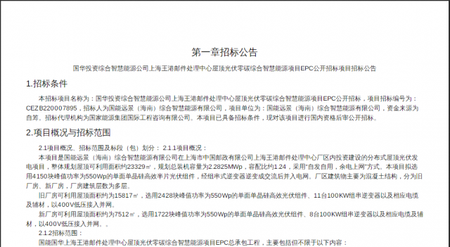 2022年對于郵件處理中心裝光伏的投資也逐漸火熱。9月13日,上海市中國郵政有限公司廠區(qū)內(nèi)投資建設(shè)的分布式屋頂光伏發(fā)電項目,明確新舊廠房都要裝光伏!整體規(guī)劃屋頂可利用面積約23329㎡,新、舊廠房可利用屋頂面積分別約為7512㎡、15817㎡,規(guī)劃總裝機容量2.2825MWp,采用“自發(fā)自用,余電上網(wǎng)"方式。共計選用4150塊單面單晶硅高效光伏組件。