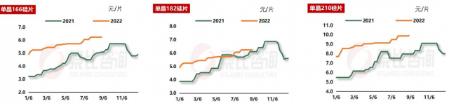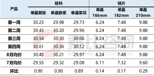 根據(jù)索比咨詢對(duì)多家硅片制造商的調(diào)研:就8月硅片價(jià)格行情來看,單晶166mm均價(jià)漲至6.24元/片,較7月環(huán)比上升2.1%;單晶182mm均價(jià)漲至7.48元/片,較7月環(huán)比上漲2.2%;單晶210mm均價(jià)漲至9.88元/W,較7月環(huán)比上升2.9%。
