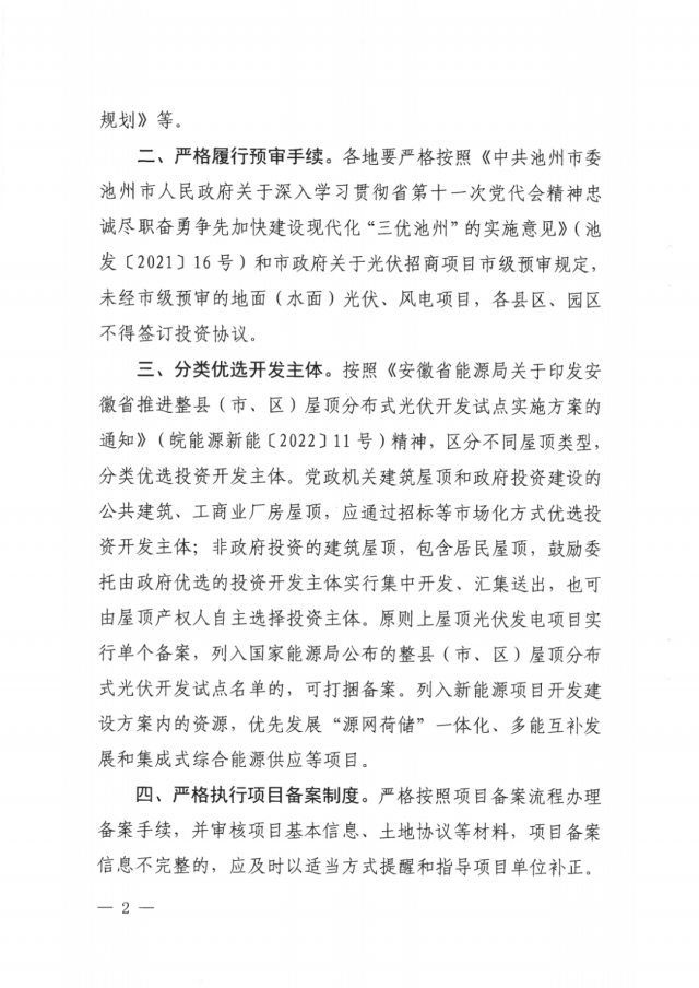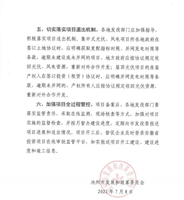 通知強調(diào):各地要嚴格按照《中共池州市委池州市人民政府關(guān)于深入學習貫徹省第十一次黨代會精神忠誠盡職奮勇爭先加快建設(shè)現(xiàn)代化“三優(yōu)池州”的實施意見》(池發(fā)(2021] 16號)和市政府關(guān)于光伏招商項目市級預審規(guī)定,未經(jīng)市級預審的地面(水面)光伏、風電項目,各縣區(qū)、園區(qū)不得簽訂投資協(xié)議。